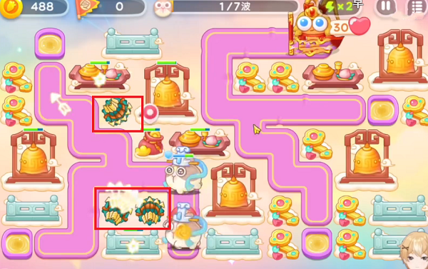 5、第五波会出现重生兔,重生兔留下来的道具一定要第一时间去清掉,然后对付雷公的这个楔子可以在旁边建一个一级防御塔。