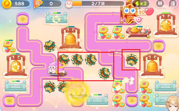 1、开局造两个弓箭升满级,下方打掉道具后加弓箭,也升到满级,解决完第一波全部粉兔后,锁定钱袋。