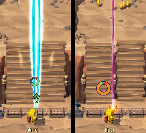 按住屏幕后,手指旁边会出现蓄力槽。在蓄力槽处于绿色区域时抬起手指不会触发攻击,只有当蓄力槽达到橙色(一段蓄力)或者红色(二段蓄力)区域时才会触发攻击效果。不同武器的蓄力方式有所区别,部分武器需要改造后才能解锁二段蓄力。