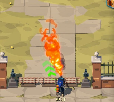 操作喷火器时,只需要长按想要攻击方向的地面即可开火;长按的过程中缓慢滑动手指,则喷火器的开火方向也会随之改变。