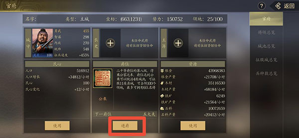 1、检查官府的爵位有没有升级,爵位到达“不更”才可以征服一座县城。
