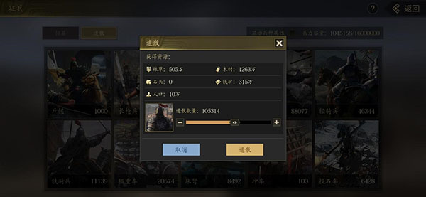 2、点击调动里的兵力和资源把城里所有的兵力和资源搬空。并且玩家可以训练多支队伍用分城同时暴兵,提高暴兵的效率。