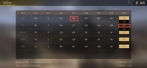 1、在我们获得了更多的人口以后,可以召集更多的高级兵种,但是高级兵种征兵的时间比较长,我们可以将勇武属性最高的将设为城守,以此最大程度地减少征集的时间。(注意要先设立城守再用武曲星护符最后再征兵)