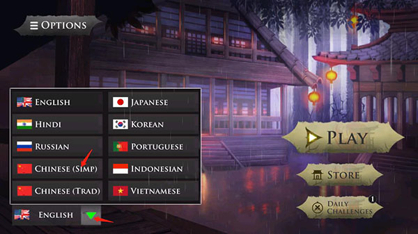 1、游戏初始为英文,点击左下角的语言选择,然后切换CHINESE;