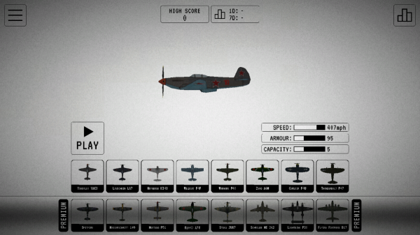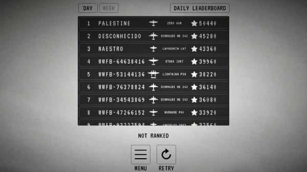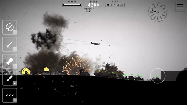 5、当被其他轰炸机击沉或撞上地面时游戏结束,根据所获得的分数进行全球排名。