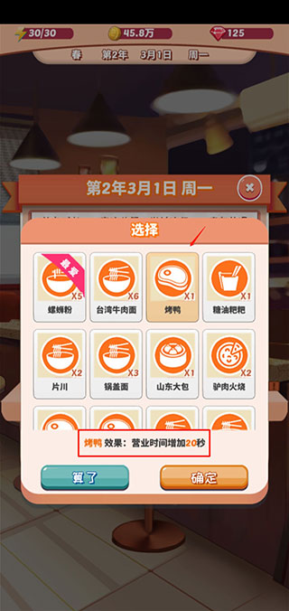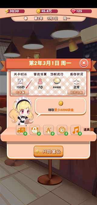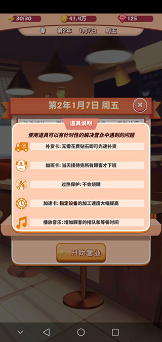 增加营业时间除了要高体力的员工还可以使用道具的,吃早餐就可以增加营业的秒数,然后还有必胜,接待完所有顾客才下班的