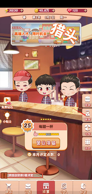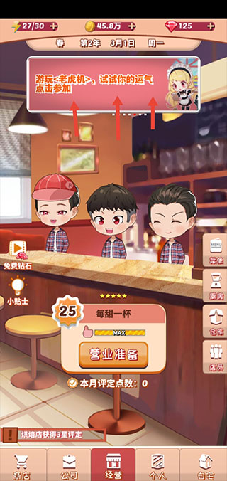 最好尽量都完成每天营业时候的任务,因为每月都有餐厅星级评定,星级越高,顾客就会越多的,同时也会提高店铺所有菜品价格