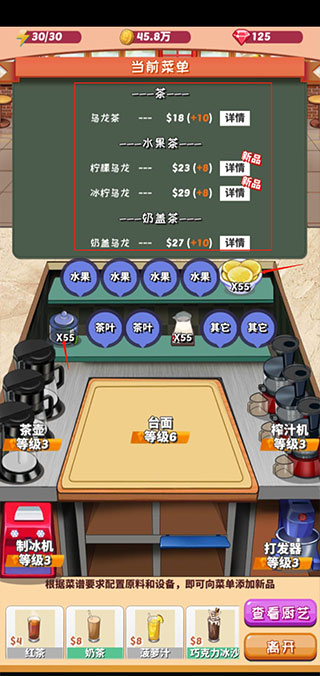 比如学了冰柠乌龙,就要在商店买了乌龙茶叶和柠檬还要开了制冰机才可以的哦,你上架原料后上面也会显示出你当前的菜单的