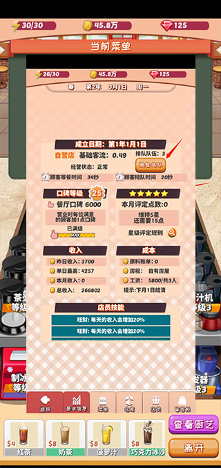 2、提高餐厅星级,星级越高价格也会高(星级1-5,造诣是1-6的,造诣默认开始就有1星)