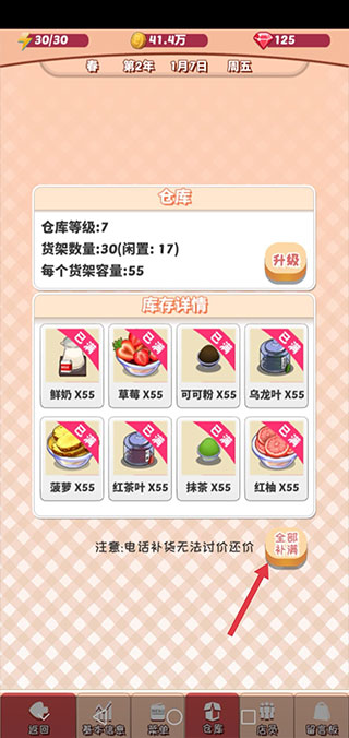 如果手速比较快的小可爱觉得顾客比较少可以按着,可以额外增加多5个顾客,记得每次营业前确保仓库库存足哦