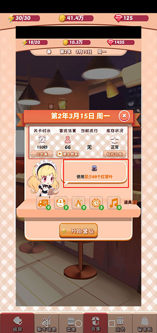 有时候营业任务遇到这种要使用多少个红茶/乌龙茶等等之类的,觉得有点困难又不想看广告的话,可以去厨房把原料换了出来然后再换回自己的菜单这样,任务就会刷新的了,因为这个任务是随机的哈
