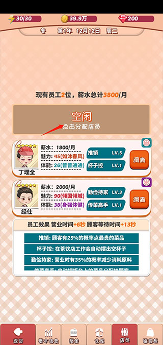 招了员工后需要点击店员-分配到需要的店里去才可以触发技能