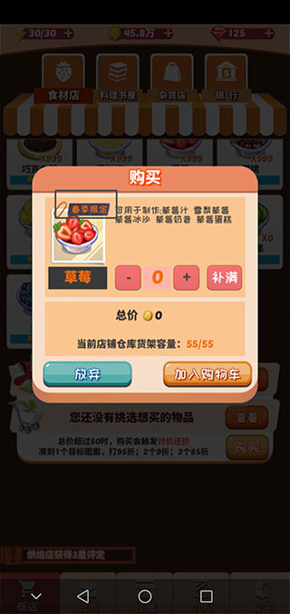 另外商店的食材的是可以上下滑动的,一般当季水果都在最下面的,如果有些反季水果想要购买,点击的时候是会提示什么季节上架的,当季水果也会显示什么季节限定的