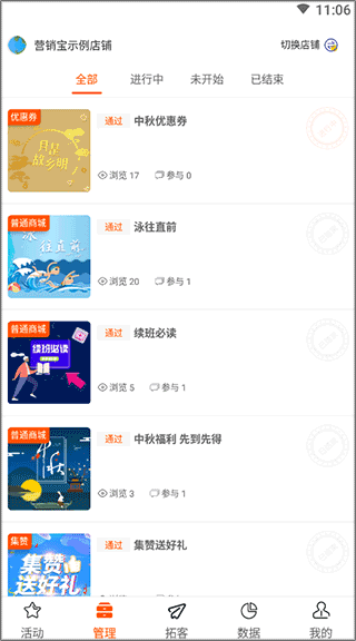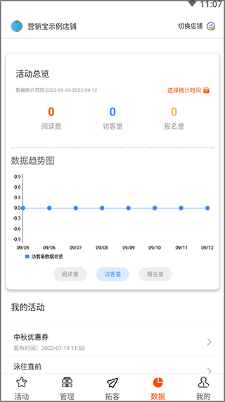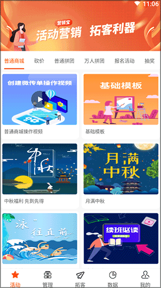 1、下载安装好营销宝app,点击活动可以使用许多的模板。