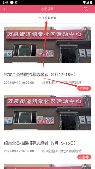 4、当前页面可以查看附近哪些地区正在招募志愿者,也可以通过上方下拉菜单进行分类选择志愿类型;