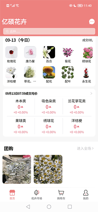 1、打开云南亿硕花卉软件,首页展示的有今日画价、团购信息和热销信息等;