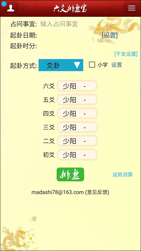(1)支持阴阳爻排盘、钱币排盘、卦名排盘、数字排盘和日期排盘
