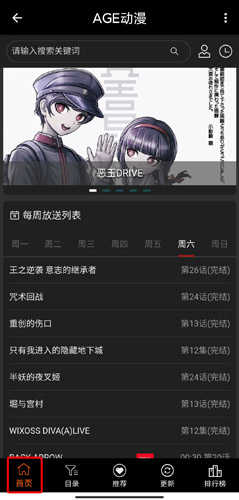 1、首页页面:会进行每周放送,可以查看到每天的动漫更新情况;