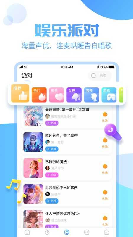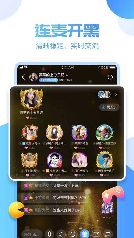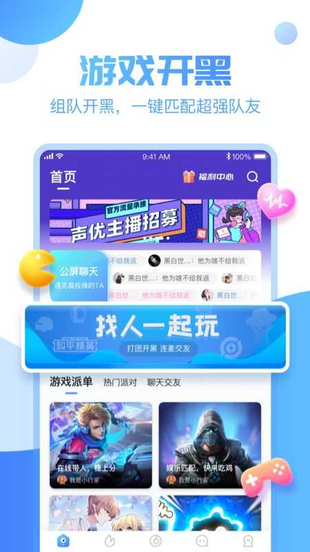 2、汇集了各个领域的颜值用户,线上自由交友聊天,邀请组队开黑,畅玩各种游戏。