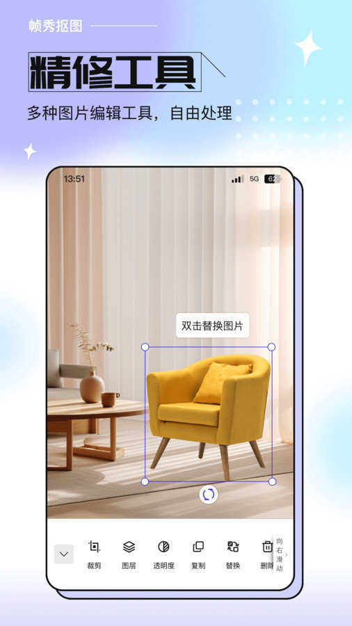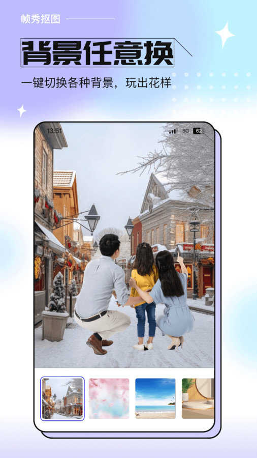 4、app能智能识别背景,可以实现背景的轻松替换,这样可以让您的图片更具创意。