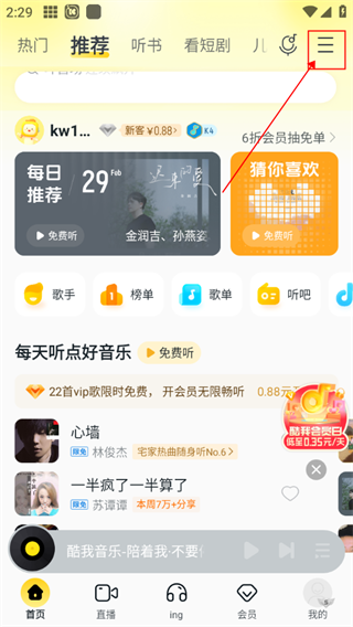 1、进入到【酷我音乐】之后,我们需要点击首页右上角的“三”进入菜单。