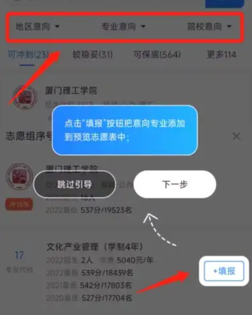 有地区或者专业意向的同学,可以使用模拟填报功能,系统会根据你筛选的意向推荐“冲稳保”院校,并显示录取概率,一目了然。
