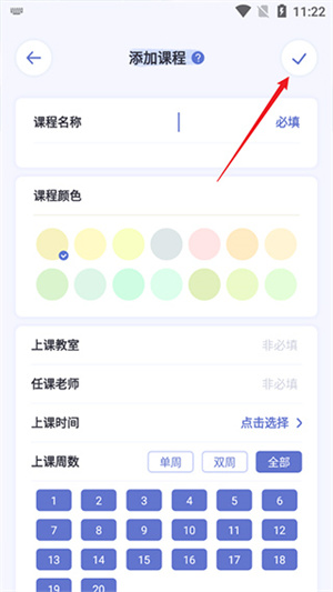4、进入新页面后,进行课程名称、上课周数等设定后,点击红箭头所示位置,完成课程添加。
