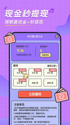 猜歌福利app让你通过猜测歌曲赢取丰厚奖品,在这里你可以不断挑战各种猜歌关卡,成功解锁可获得更高奖励。此外,你还可以参与其他任务,完成后可以查看详细的奖励信息,并且支持根据音乐猜歌名的功能。