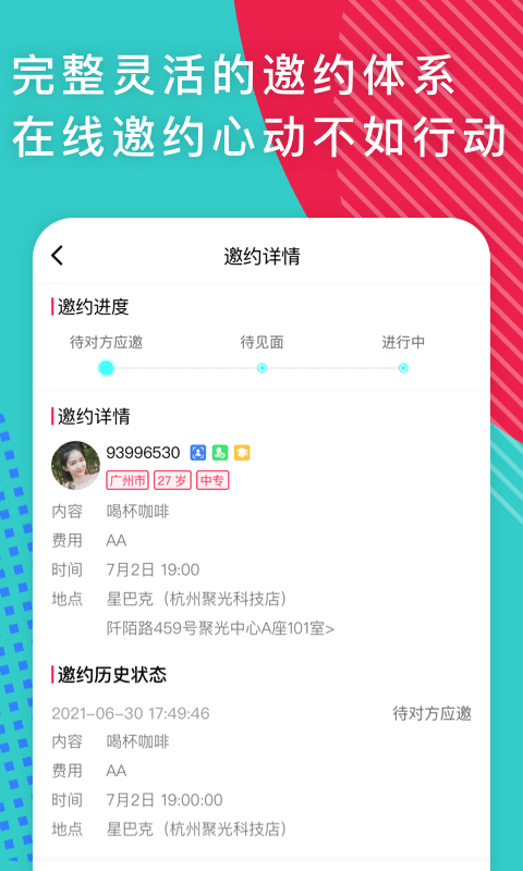 2.如果对方接受邀请,会在经核验的咖啡厅、茶馆或餐厅等环境中选择您要约会的地方,保证安全性。