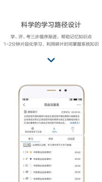 该应用程序要求购买课程(具体信息请参阅中欧商业在线官方网站),获取用户名和密码后,方可登录并访问学习资源。