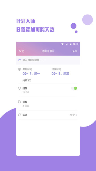 3.快速添加日程任务:语音、文本各种方式输入添加任务与日程安排,5秒管理1个任务日程