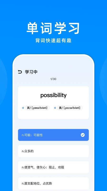 以后只要有时间就能在这里开始背单词了,帮助你不断的记背更多单词内容