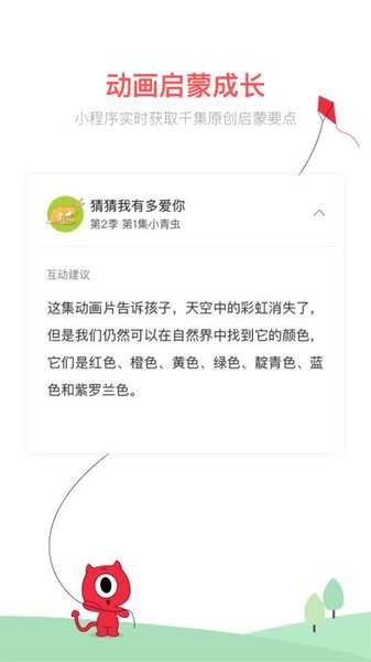 每天推荐一个简单的亲子 互动游戏 ,既有趣又有趣,因此孩子们可以期待亲子陪伴的日常活动。 父母打开他们的微信小程序,可以方便地获取他们孩子当天观看的每一集动画的启发收获,并真正个性化亲子情感联系主题和互动游戏。