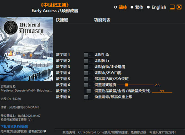 数字键1-无限生命:激活此功能后,玩家的生命值将始终保持满状态,无论遭受何种攻击都不会减少,让你在战斗中立于不败之地。数字键2-无限体力:开启此功能后,玩家的体力将无限,无论是奔跑、跳跃还是战斗,都不会感到疲惫,极大地提升了探索和战斗的效率。数字键3-无限食物/不会饥饿:此功能确保玩家永远不会感到饥饿,无需担心食物短缺,可以专注于其他重要任务。数字键4-无限水/不会口渴:激活后,玩家将不再需要寻找水源,口渴感将完全消失,让你在野外探险时更加轻松。数字键5-最高清洁度/不会变脏:此功能让玩家始终保持清洁状态,无需频繁洗澡或更换衣物,节省了大量时间。数字键6-设置游戏速度:玩家可以自由调整游戏速度,加快或减慢游戏进程,以适应不同的游戏需求。数字键7-设置物品数量/金钱:此功能允许玩家随意调整物品数量和金钱,轻松获得所需资源,无需花费大量时间收集。数字键8-负重清零/最高负重上限:激活后,玩家的负重将清零或达到最高上限,让你可以携带更多物品,无需担心超重问题。