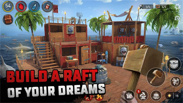 比如是地基,木板,楼梯,柱子等,一只创造锤就能解决任何与建造相关的问题。当鲨鱼攻击地基的时候要及时利用木质矛去反击,一来通过事后修补能减少相比建造木筏来说更多资源的消耗,二来鲨鱼在收到一定程度的攻击后便会死亡,在尸体消失的这段时间里,可以不受危险的在附近周围搜刮资源,当然别忘记了还有鲨鱼肉可以吃。