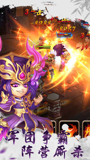 2、采用Q版画风,众多名将以Q萌造型出现,升级养成,排兵布阵自由战斗炫酷技能轰爆全场;