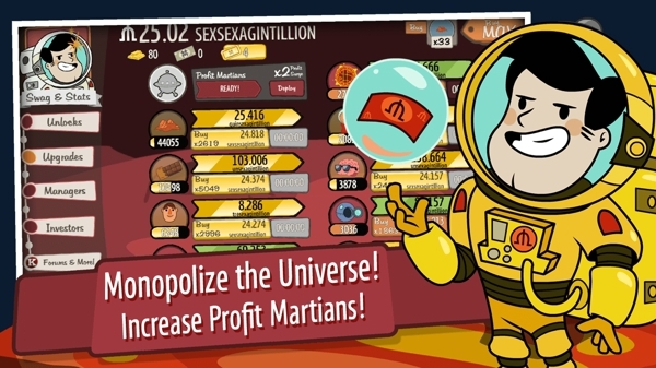 游戏开始时,你只能通过贩卖柠檬来积累初始资金。虽然点击一颗卖掉一颗的速度较慢,但你可以用赚来的钱购买利润更高的产品进行转卖。随着资金的增加,你可以雇佣管理者,从而解放双手,实现自动挂机赚钱。从最初的柠檬摊到报纸、披萨、甜甜圈,再到经营球队、银行、石油等,你的赚钱速度将越来越快,而需要操作的内容却越来越少。这种设计非常符合经济逻辑——高层管理者不再需要亲自参与体力劳动。此外,如果你有好的项目,还可以吸引天使投资来增加巨额资金,进一步加速你的财富积累。