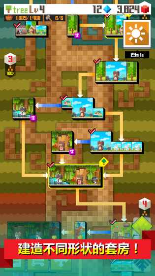 3、发展小动物是游戏的一大亮点,玩家通过点击大树可以获得大量宝石。同时,你需要招募小动物为你工作,并通过合理的策略让它们协同合作,共同发展。