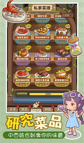1、透过精心设计的二合玩法,您将解锁各种美味的菜谱,有前菜、饮品、主菜、时蔬、主食、甜点,每一道菜都是一次对您烹饪技艺的挑战和提升。从传统的家常菜到创意无限的特色料理,每一道菜都会吸引不同口味的顾客光临您的餐厅!