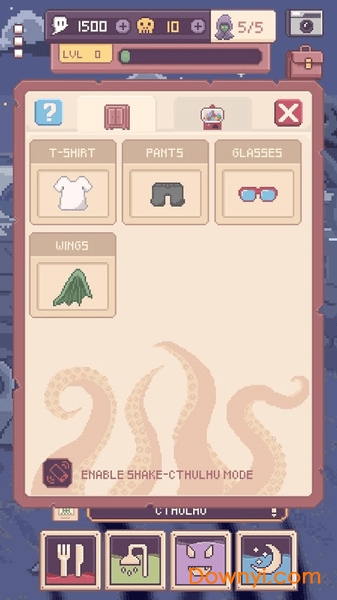 50多件T恤,裤子,翅膀和眼镜个性化装扮克苏鲁。玩家可以为克苏鲁选择各种服饰和配饰,进行个性化装扮,让它更加独特。