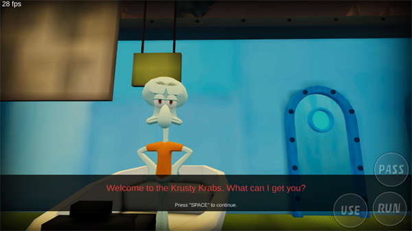 3、进入蟹堡王餐厅,与章鱼哥对话,获取关键信息,为进入地下室做好准备。