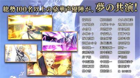 川澄绫子、植田佳奈、坂本真绫、樱井孝宏、神谷浩史等40多位顶级声优全程配音,武内崇等50余位知名画师联手奉献百余精美角色,带您亲自体验史上最大规模的圣杯战争!