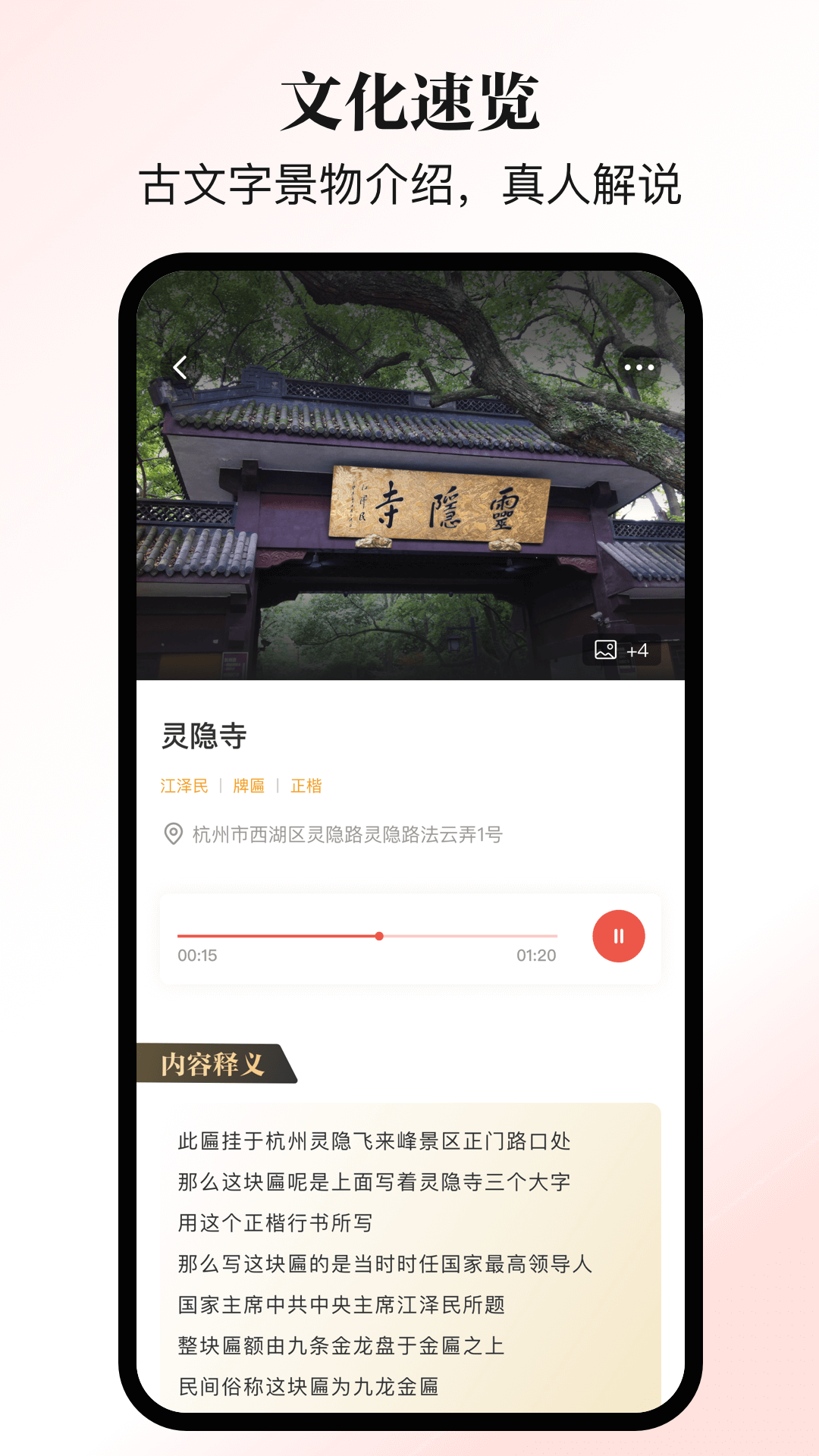 您可以使用拍照功能或上传相册中的景物图片,系统将自动识别并提供内容释义和相关故事。此外,应用还提供真人讲解功能,让用户更直观地了解景物的历史和文化背景。使用场景十分广泛,无论是在旅途中拍摄,还是在家中休闲时浏览,乐行乐见都能帮助您快速获取景物背后的文化信息,让您的旅行体验更加丰富多彩。
