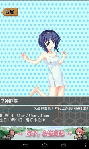 达成神明下达的任务:神明会向你下达指令,完成它们即可获得丰厚奖励,提升温泉的运营效率。利用GPS获取资金:利用GPS情报进行营业,便可获得少女们的活动资金,扩大温泉的规模。全国巡演:利用定量的资金,和少女们一起进行全国巡演,拜访名胜古迹,提升温泉的知名度。具体内容会记载在回忆手册中,供玩家随时回顾。和少女们加深羁绊!:去各地巡演,获取报酬,然后再和少女们友好相处,培养感情,查看有关她们的故事,解锁更多有趣的剧情。游戏玩法多样,既有经营元素,也有互动和探索内容,为玩家提供了丰富的游戏体验。