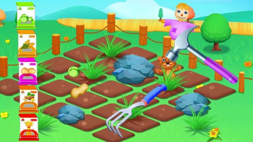 2.这里有一块没有种植作物的地,我要在这里种植我喜欢的作物,赶紧和我一起搬走石块,除掉杂草,赶走耗子吧。清理土地后,你可以选择种植小麦、玉米、胡萝卜等作物,体验从播种到收获的全过程。