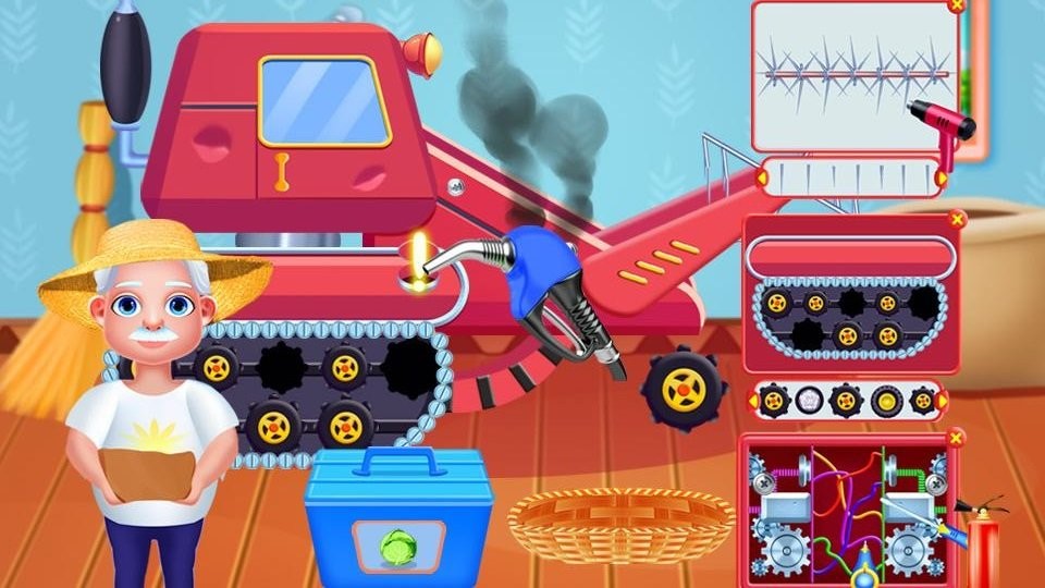 4.非常糟糕的是爷爷的收割机坏了,我们赶紧把它修好吧。修理收割机需要收集零件和工具,完成后你可以顺利收割农作物,确保农场的高效运作。
