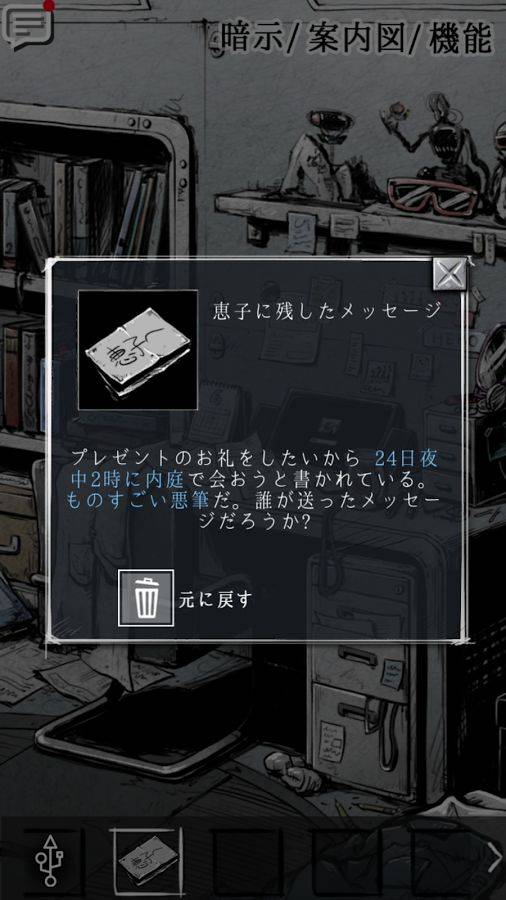 2、手绘恐怖风格的游戏画面,令人毛骨悚然的背景音乐;画面细节丰富,背景音乐与场景完美融合,进一步增强了游戏的沉浸感和紧张氛围。