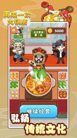 《再来一次火锅店》是一款极具创意的模拟经营类游戏,让玩家化身为火锅店老板,体验从零开始打造一家火爆餐厅的乐趣。游戏以真实还原火锅店经营为核心,从锅底制作到食材搭配,再到顾客服务,每一个环节都充满挑战与惊喜。玩家需要根据顾客的需求,精心调配锅底,选择新鲜食材,并快速完成上菜任务。同时,游戏还融入了丰富的互动元素,比如与顾客的趣味对话、解锁特殊任务等,让经营过程更加生动有趣。无论是火锅爱好者还是模拟经营游戏迷,都能在这款游戏中找到属于自己的乐趣。现在就下载《再来一次火锅店》,开启你的美食创业之旅吧!