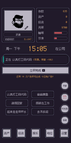 2、游戏码农那些打工的日子拥有丰富的玩法,轻松的升级体验,多种不同的赚钱方式让你感受各种生活。无论是通过编程赚取收入,还是通过投资实现财富增值,你都能在游戏中找到适合自己的发展路径。