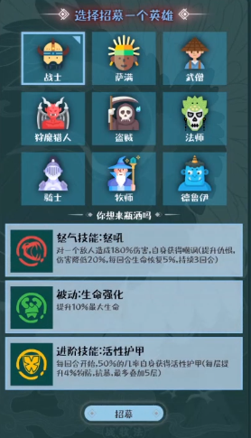 1、选择英雄,一共九个英雄职业可以选择。一般1-2个前排,1-2个输出,0-2个辅助,看个人喜好。游戏中的英雄选择非常重要,玩家需要根据战斗需求合理搭配英雄阵容。每个英雄都有独特的技能和战斗方式,玩家需要通过不断的尝试和调整,才能找到最适合自己的英雄组合。